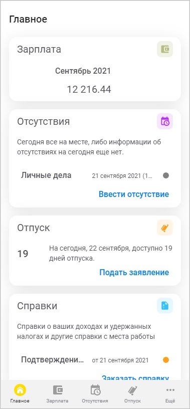 Также, через кабинет можно отправлять заявления на отпуск и командировки, заказывать справки и решать другие кадровые запросы. Например, подтверждать ознакомление с приказами, положениями и регламентами онлайн.