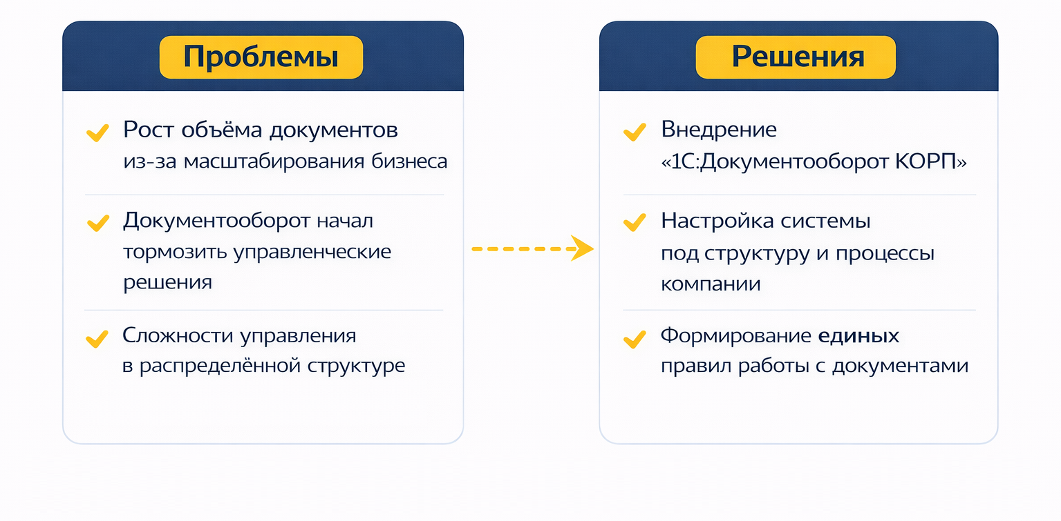 Документооборот начал тормозить управленческие решения. Стало понятно: нужна современная электронная система и команда, которая сможет настроить её под реальные процессы компании.
